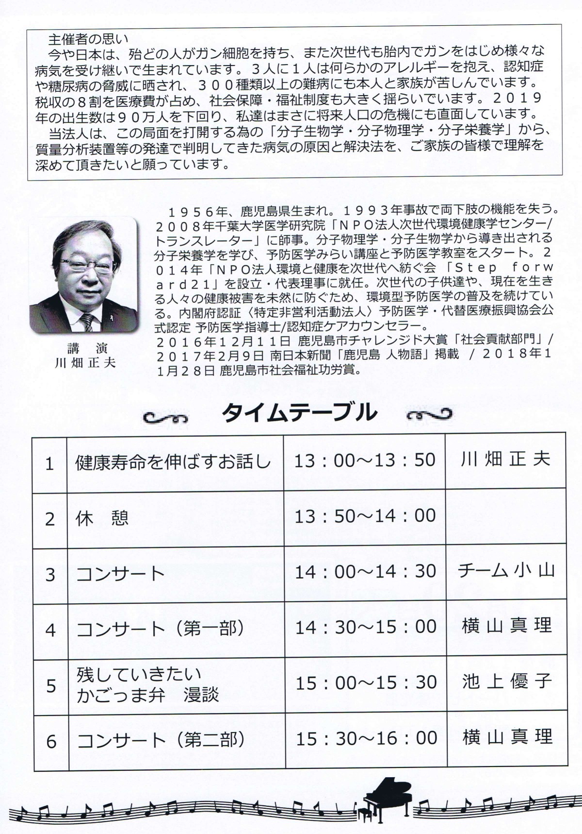 NPO法人環境と健康を次世代へつなぐ会 理事長 川畑正夫さんの講演と、穏やかなコンサートがジョイントするんだそうです。