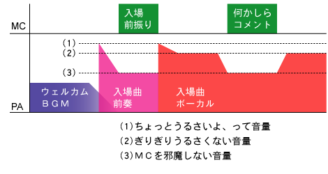 そして最低限、MC先行か音先行かを決めておきます。MCさんのナレーションを先に出すのか、曲を先に出すのか、ということです。前奏が15秒以上あるようなら、音先行にしておくのが無難です。