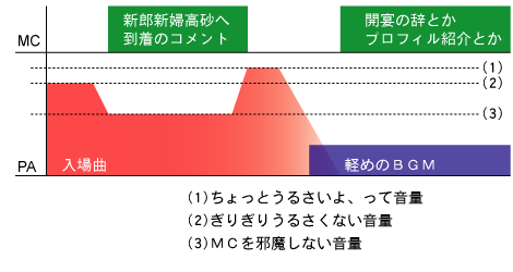 状況が許す限り、開宴前にMCさんとリハしておいた方がいいです。少なくとも、入場曲の先頭30~60秒程度は聴いてもらうことだけはしておくべきです。そうしておけば、MCさんも本番で慌てることがありません。