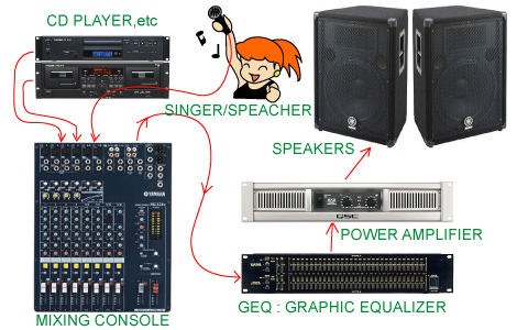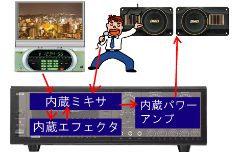 コンサート会場なんかの大掛かりな音響と、カラオケボックスのキカイがどう同じなのかと思われるでしょうが、このページの一番上の図と、この図をよく見比べれば、結構似たようなもんだと理解できると思います。