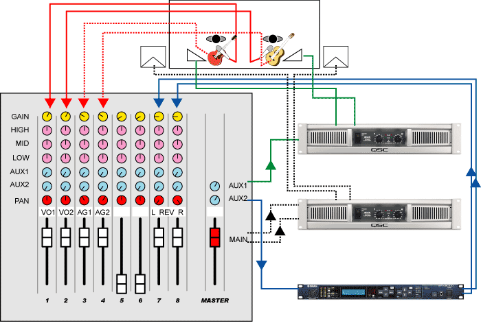 図は仕込みが終わった時点で、オモテから音が出ているだけで、返し(モニタスピーカ)からは音が出ておらず、エフェクトもかかっていない状態にしています。