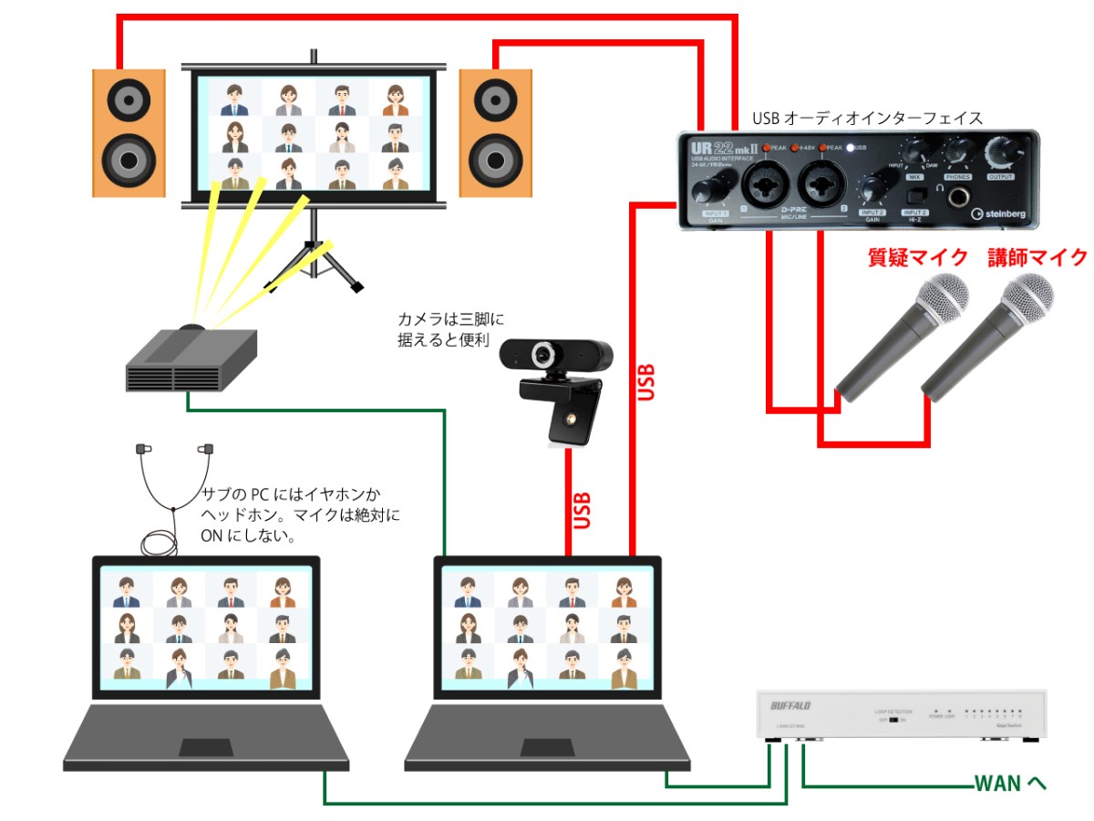 そんなわけで、図のように接続してPCを適切に設定すれば、手持ちマイクを2本、自由に使えることになります。これができないケースでは、1台のPCの前に発言者が入れ代わり立ち代わりで発言するしかありません。